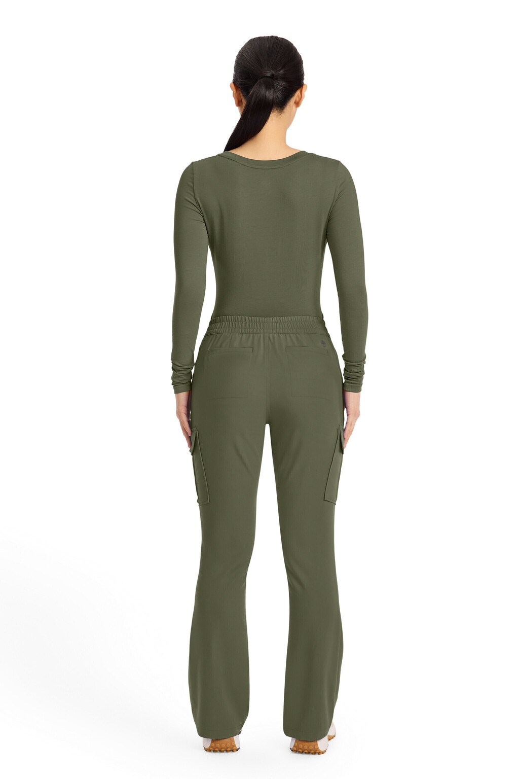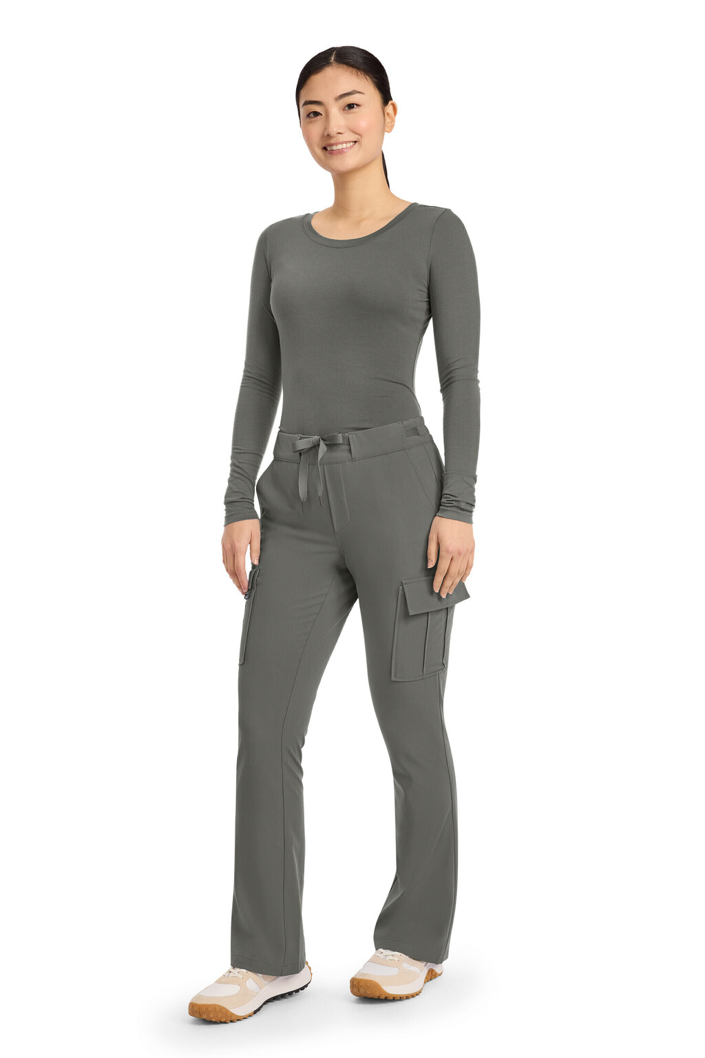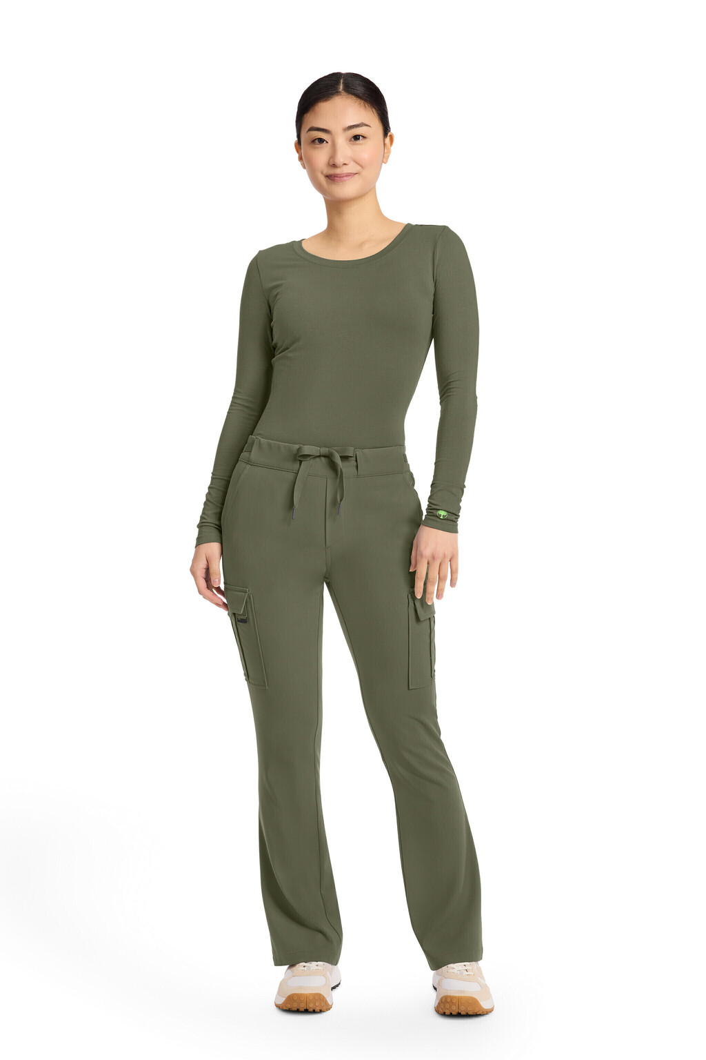 Este pantalón de tiro medio y pierna acampanada combina diseño moderno con funcionalidad para adaptarse a tu rutina. Su cintura elástica plana con cordón y presillas asegura un calce cómodo y femenino. Con seis bolsillos en total, incluidos prácticos bolsillos cargo, ofrece espacio suficiente para llevar todo lo esencial durante tu jornada.