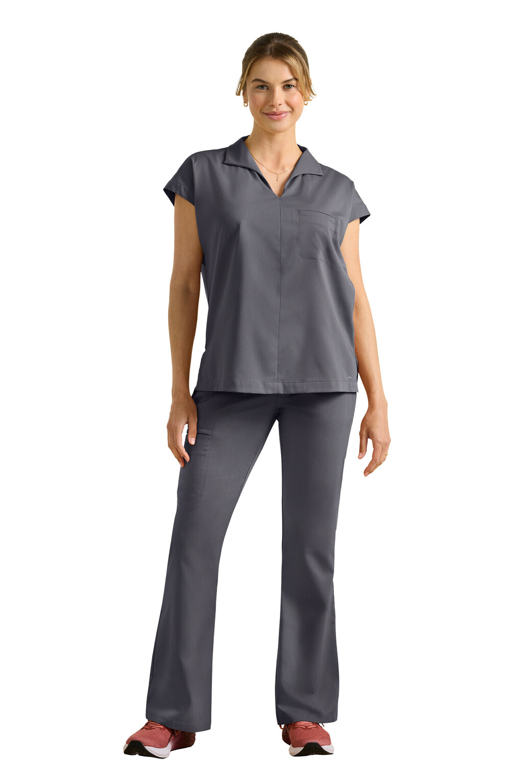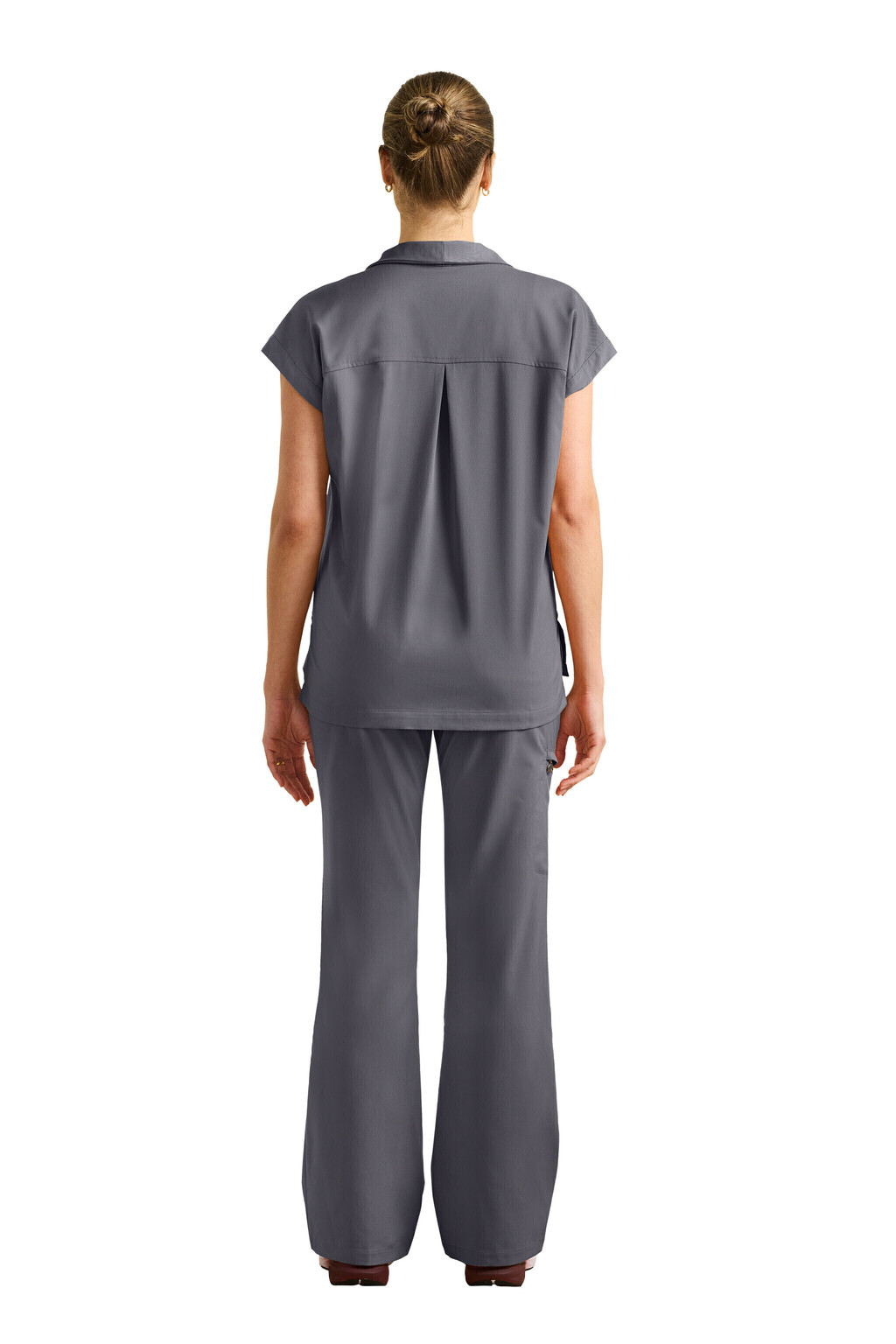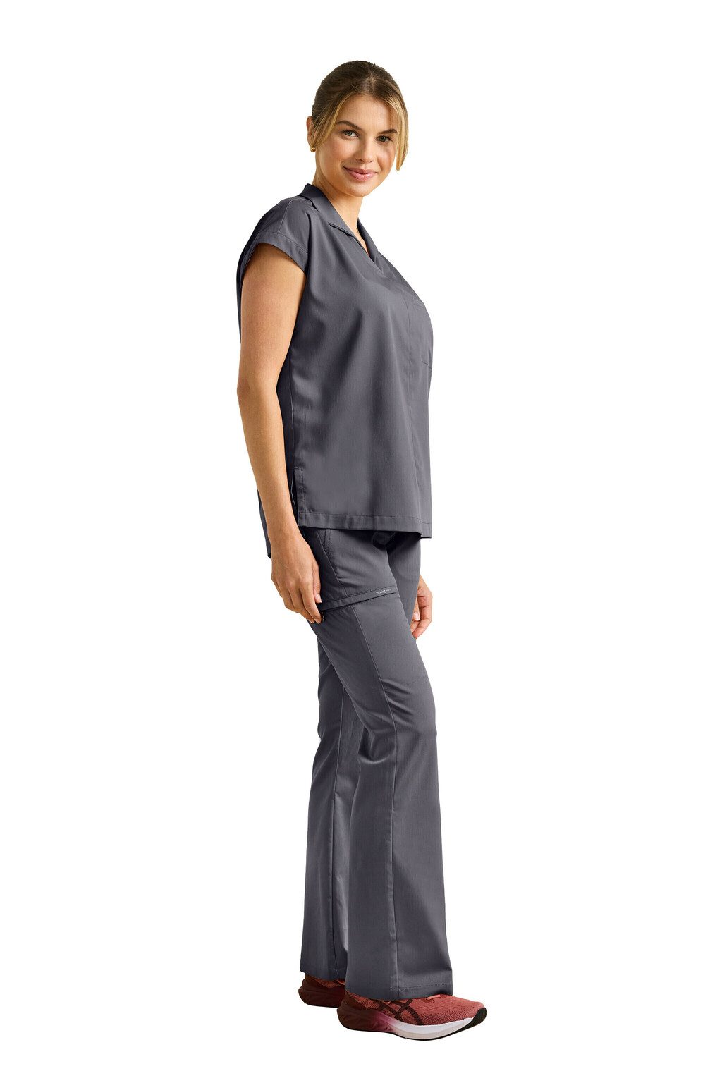 Top médico femenino moderno, con cuello tipo camisa y diseño versátil que permite usarlo suelto o fajado. Ideal para quienes buscan un look prolijo y actual, sin resignar confort ni funcionalidad.